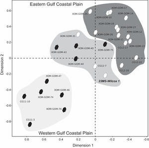 Kernel density estimation (KDE) curves and a cross-correlation coefficient comparison between Wilcox samples demonstrates spatial heterogeneity in age spectra along the western and eastern Gulf Coastal Plain (Figures 4 and 5). Two primary clusters develop in multi-dimensional space that correspond spatially to western or eastern Coastal Plain samples. This dissimilarity is primarily based on the presence and abundance of western North America Cordillera and Grenville grains, reflecting the distinct sediment sources for Wilcox strata across the basin. Western Gulf samples are typically derived from the southern Rocky Mountains, Cordilleran arc, and Mesozoic-Paleogene magmatic sources (Mackey et al., 2012), whereas eastern Gulf samples are dominated by Appalachian and Grenville signatures. A large proportional abundance of western North America Cordillera grains, typical of western Gulf Coastal Plain samples, is typically accompanied by a noticeable increased abundance of Yavapai-Mazatzal grains as well as Wyoming and Granite-Rhyolite grains. In contrast, a large proportional abundance of Grenville grains, typical of eastern Gulf Coastal Plain samples, is accompanied by smaller Paleozoic and Proterozoic grain populations.
