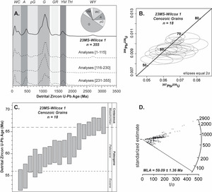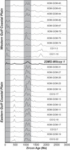 Sample 23MS-Wilcox 1 exhibits an age spectrum defined by western North America cordillera (< 250 Ma), Appalachian (490-270 Ma), Peri Gondwana (850-550 Ma), Grenville (1250-900 Ma), Granite-Rhyolite (1550-1300 Ma), Yavapai-Mazatzal (1800-1600, and Wyoming (> 2500 Ma) populations (Figure 3). Proportionately, Grenville grains represent the most abundant population, followed by western North America Cordillera, Appalachian, and peri-Gondwana populations. Yavapai-Mazatzal, Granite-Rhyolite and Wyoming populations represent minor proportional amounts. A division of the total number of analyses shows that the age spectrum of 23MS-Wilcox 1 is similar to previously reported samples with lower n-values, but that the proportional abundance of certain populations does change at a n≈115 analysis bin level. Mesozoic grains exhibit a somewhat dispersed across Triassic, Jurassic, and Cretaceous ages but contain noticeable populations around 190-175 Ma, 115-105 Ma, and 66 Ma. Eighteen Cenozoic grains range in age from ~ 66 Ma to 53.8 ± 2.6 Ma, with multiple noticeable clusters at a 2σ error level (Figure 3c).
