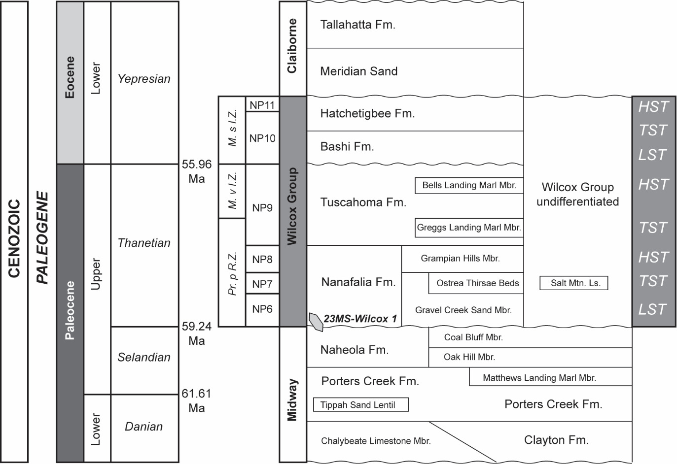 Mancini and Tew (1995) place the uppermost Midway Group and Wilcox Group strata within a sequence stratigraphic framework. In their model, the uppermost Midway Group (Naheola Formation) represents a highstand systems tract (HST), disconformably overlain at a sequence boundary (SB) by Wilcox Group strata of the Gravel Creek Sand Member and Ostrea thirsae beds. In this context the Gravel Creek Sand strata represent incised valley fill of a lowstand systems tract (LST) and the Ostrea thirsae beds represent strata deposited in a transgressive systems tract (TST). The Gravel Creek Sand Member correlates with the TA2.1 (Haq et al., 1988) and TP2.1 (Baum & Vail, 1988) sequence stratigraphic intervals, dated to approximately 58.5-57 Ma (Mancini & Tew, 1995). However, given the absence of marine fossils in northern Mississippi and the tenuous correlation of coal strata, the age and sequence stratigraphic significance of the Gravel Creek Sand Member is poorly understood. Similar poorly bracketed stratigraphic correlations are common throughout the northern Mississippi Embayment, where marine fossils are largely absent (Cushing et al., 1964; Waldron et al., 2011) and Paleocene and Eocene pollen assemblages in carbonaceous strata remain poorly systematized in the Mississippi embayment (Potter & Dilcher, 1980; Frederickson et al., 1982), but are better characterized in the Texas Gulf Coast (Crabaugh & Elsik, 2000; Elsik & Crabaugh, 2001; Zarra et al., 2019).