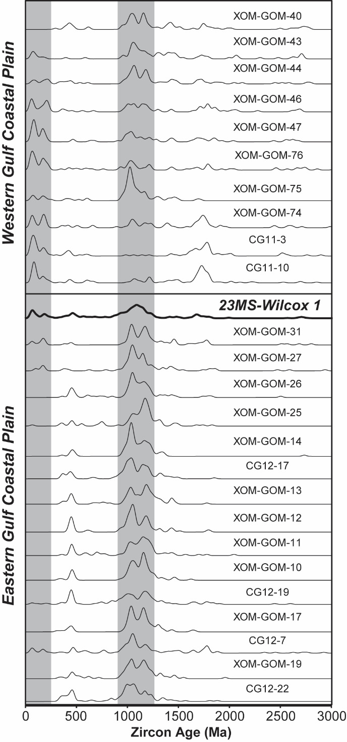 The first scenario involves routing material through the northern Mississippi Embayment and Mid-Continent, recycling Pennsylvanian strata from the Illinois Basin and or up Cretaceous strata in the northern Mississippi Embayment providing the needed source signature of pre-Mesozoic grains in the 23MS-Wilcox 1 age spectrum. This routing pathway would only require the addition of Mesozoic and Cenozoic grains from the western North America Cordillera to complete the observed age spectrum. These scenarios can both be supported by the similarity between 23MS-Wilcox 1 and samples GOM-40 and GOM-43 in the northern part of the Mississippi Embayment.
