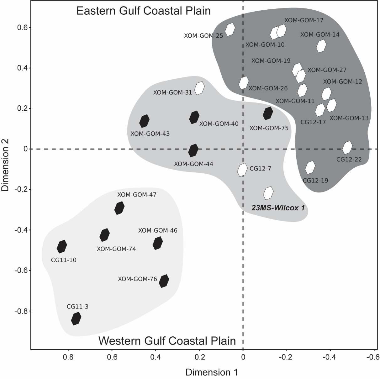 23MS-Wilcox 1 was analyzed in the TRAIL at the University of Arkansas while all other comparison samples were analyzed in the LaserChron Center at the University of Arizona. We also employed a whole grain mounting approach, which allowed for depth profiling during analyses. Every other sample was mounted in epoxy and the exterior parts (10s of microns) were removed to expose an internal, cross-sectional area of the grains. Jackson et al. (2021) note the same discrepancies in sample comparison for Cretaceous samples along the eastern Gulf Coastal Plain and show that data are consistent across labs and mounting approaches. The similarity between 23MS-Wilcox 1 to other Wilcox Group samples across the western and eastern Gulf Coastal Plain supports an interpretation that laser ablation inductively coupled plasma mass spectrometry (LA-ICPMS) results produced from various labs using differing analytical approaches can reliably produce comparable datasets.