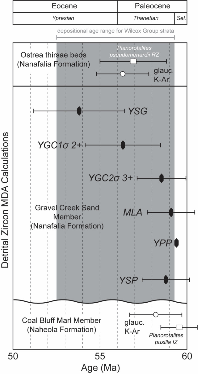 The presence of near syndepositional grains in Wilcox strata, along with sediment provenance and depositional setting context, indicates that detrital zircon U-Pb geochronology is an ideal approach to understand stratigraphic ages for the Gravel Creek Sand Member and correlative strata throughout the eastern Gulf Coastal Plain. However, results from this study highlight the complexity in assessing various MDA approaches and the geologic implications between determinations (Table 1; Figures 6). For example, if the YSG is used for a MDA then the basal Wilcox, and by extension the entire Wilcox Group, should be interpreted as Eocene. This is problematic because an Eocene age for the basal Wilcox is at odds with biostratigraphic determinations for this horizon in Mississippi and Alabama (Elsik & Crabaugh, 2001; Mancini & Tew, 1995; Zarra et al., 2019). The YSG is a good analysis, which passed all quality control filters during data reduction. It also overlaps in 2σ error with the biostratigraphic and a glauconitic sand K-Ar age for the overlying Ostrea thirsae beds. However, it is noticeably younger in age than the underlying Coal Bluff Marl Member and all other MDA calculations.